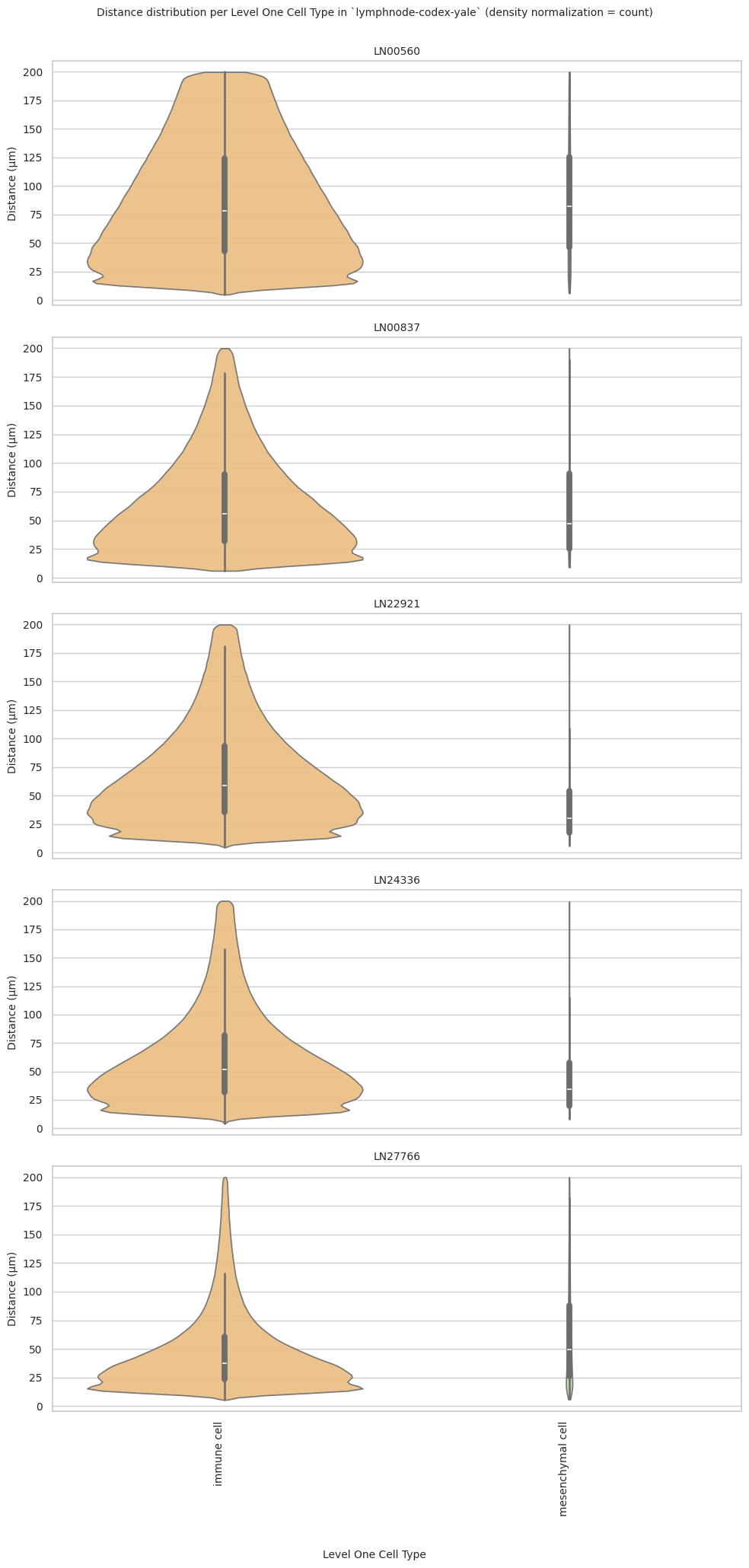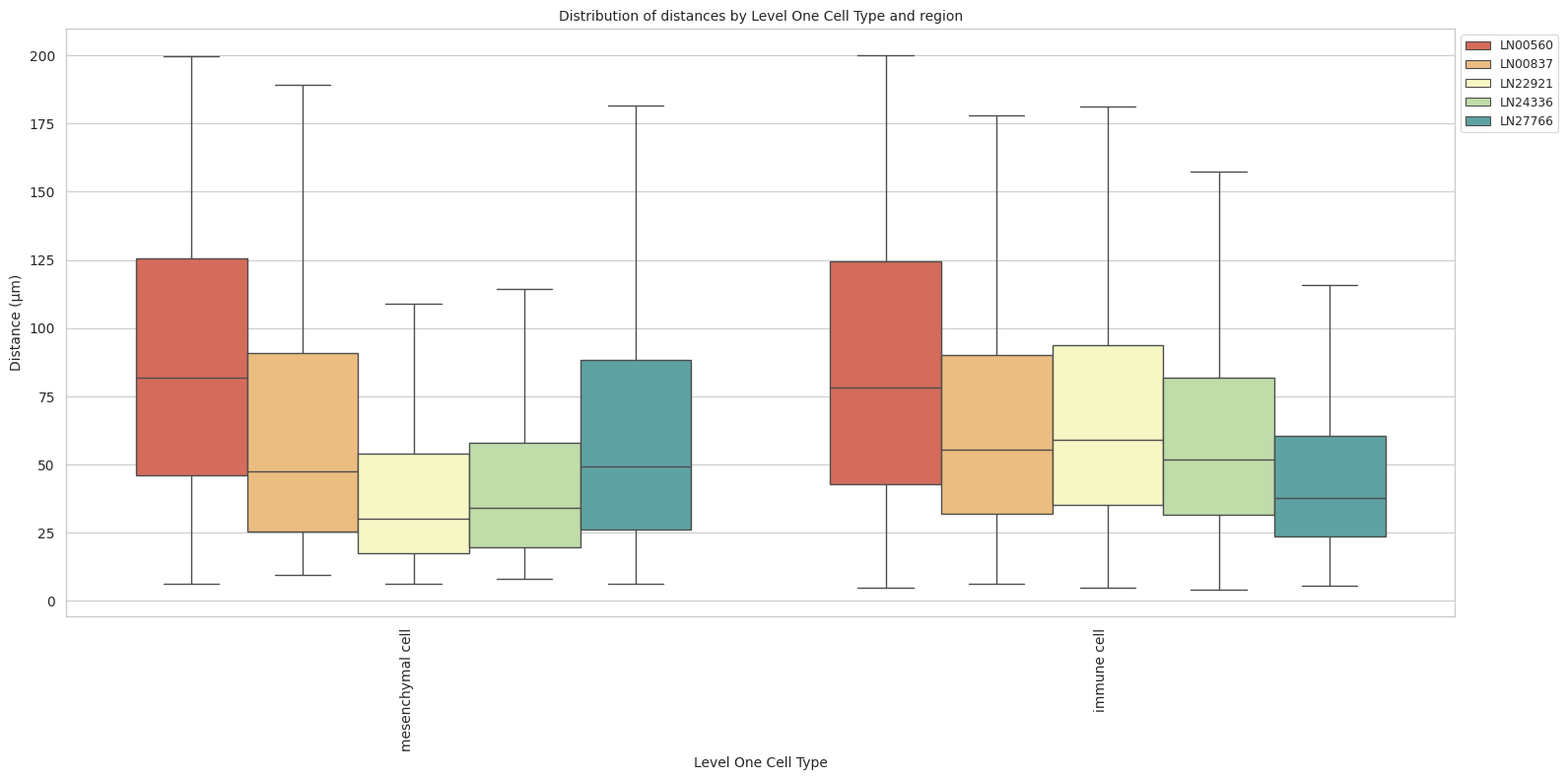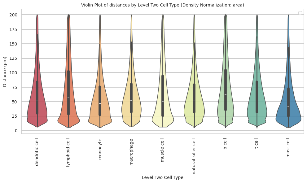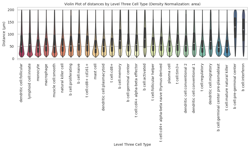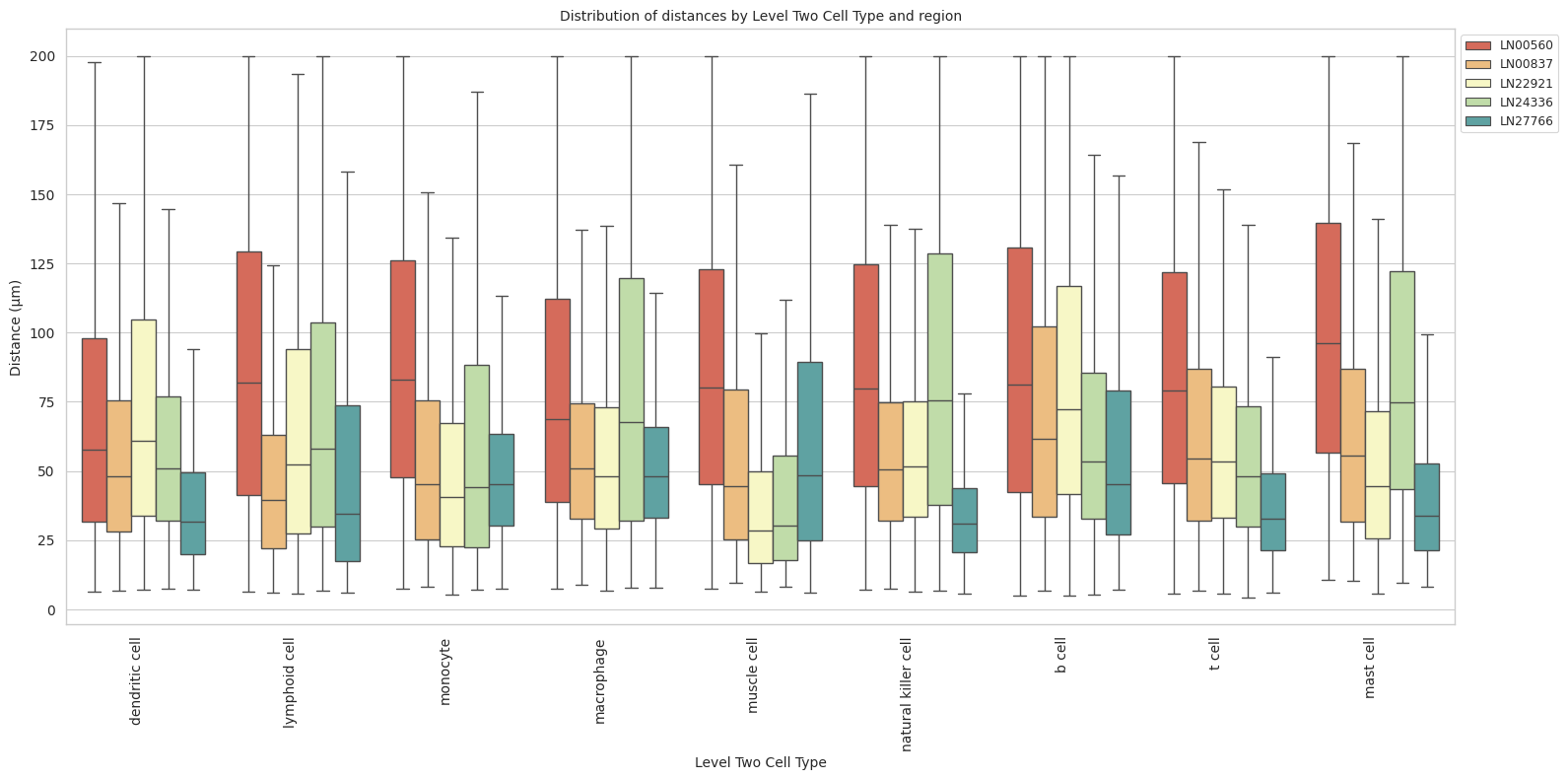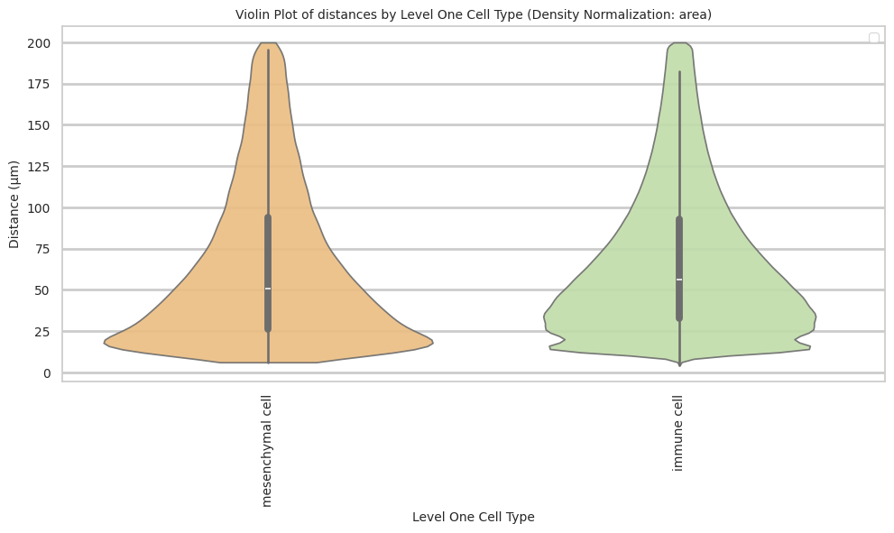 Analyze and visualize cell-to-nearest-endothelial-cell distance distributions for the