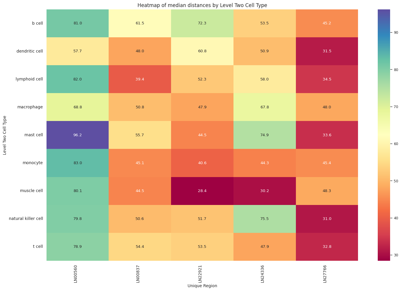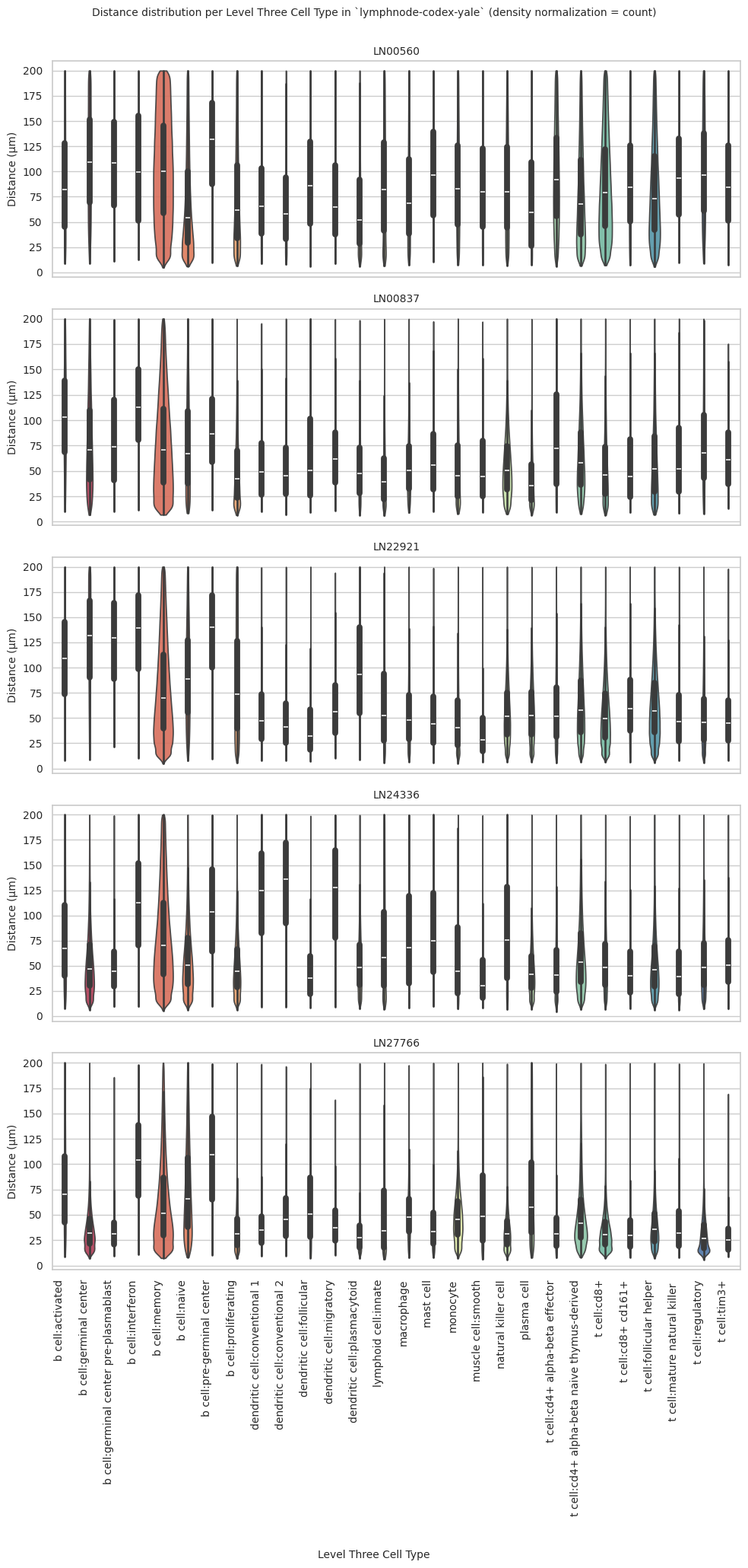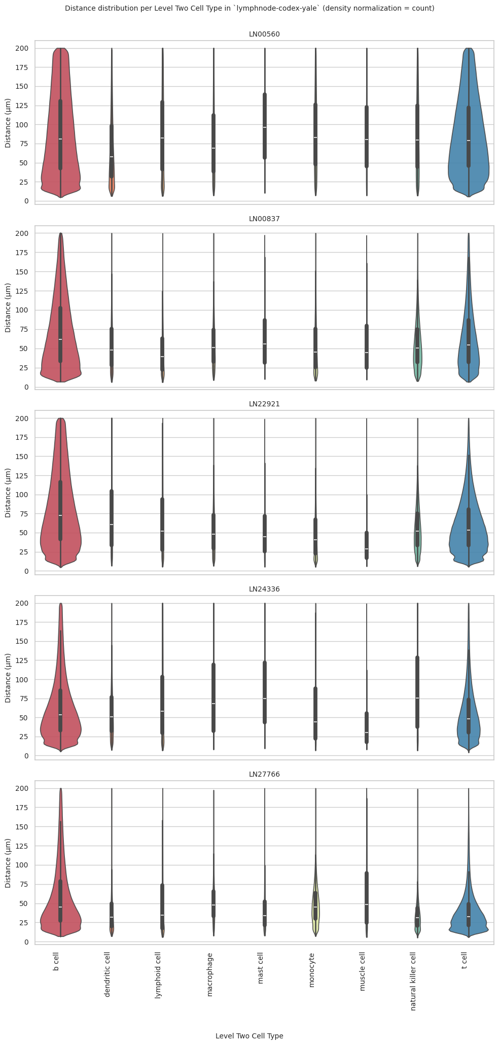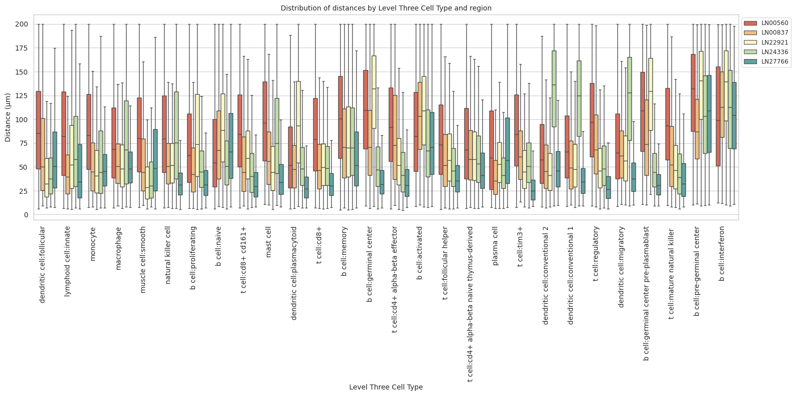 Analyze and visualize cell-to-nearest-endothelial-cell distance distributions for the