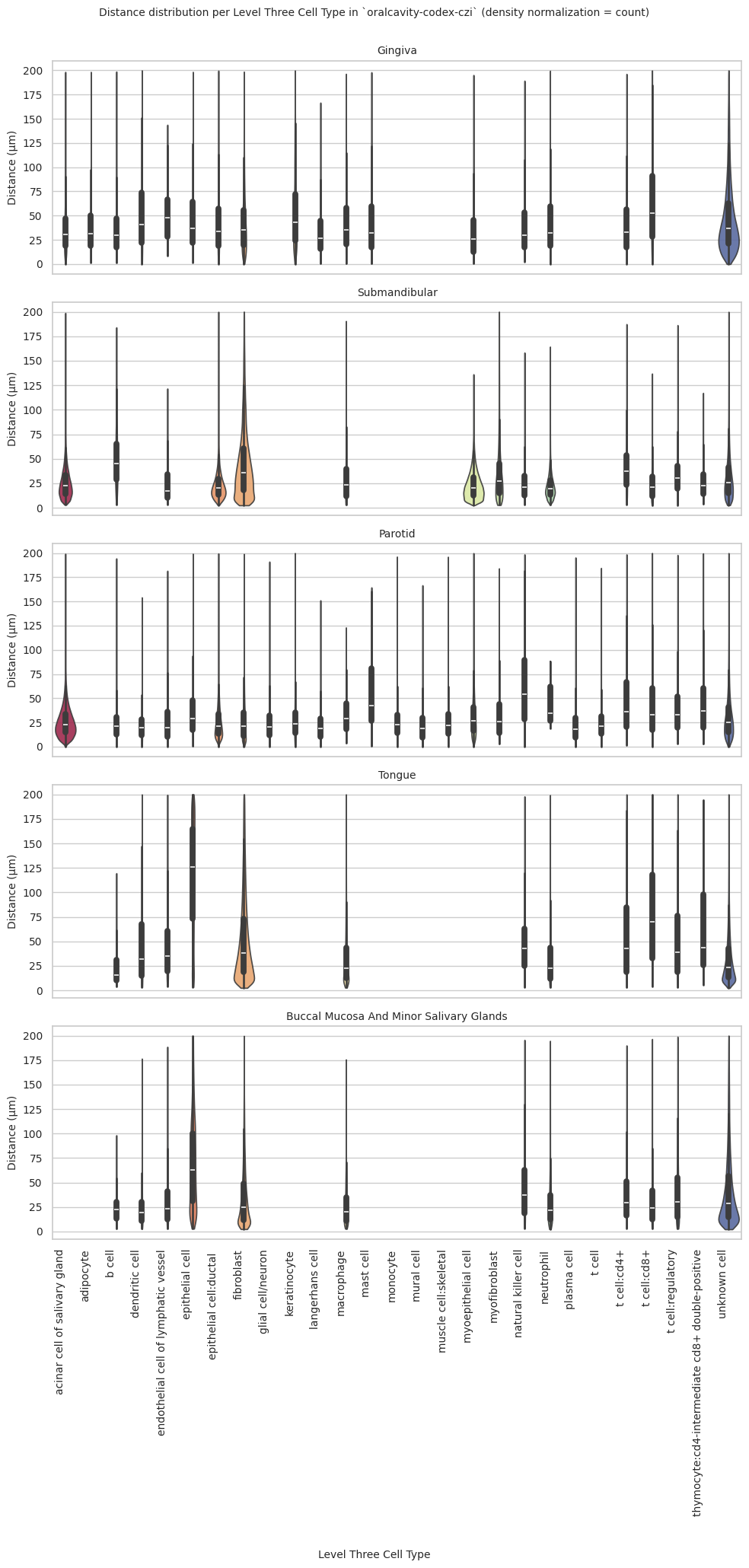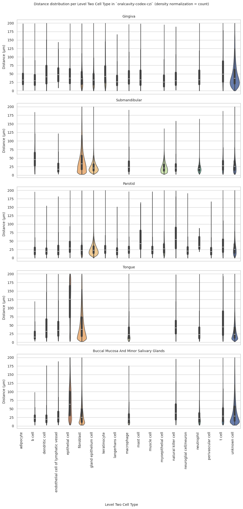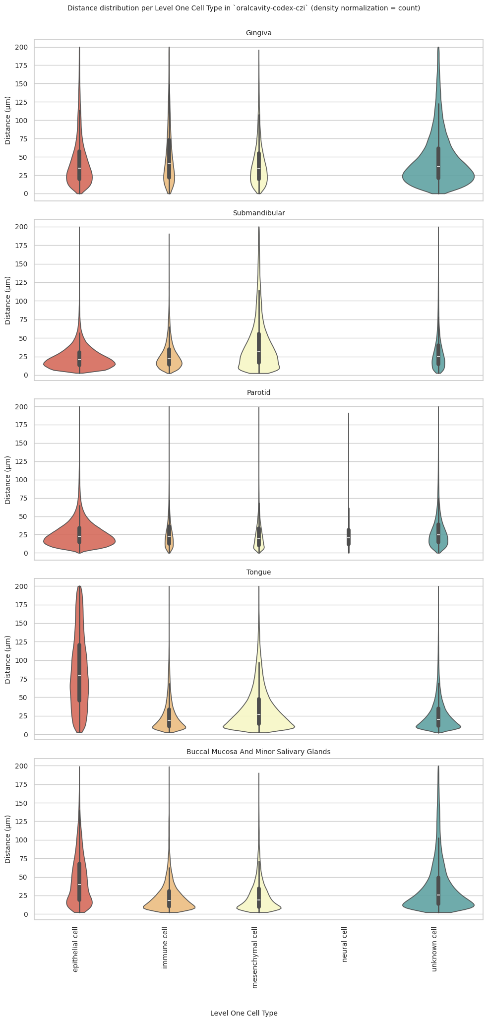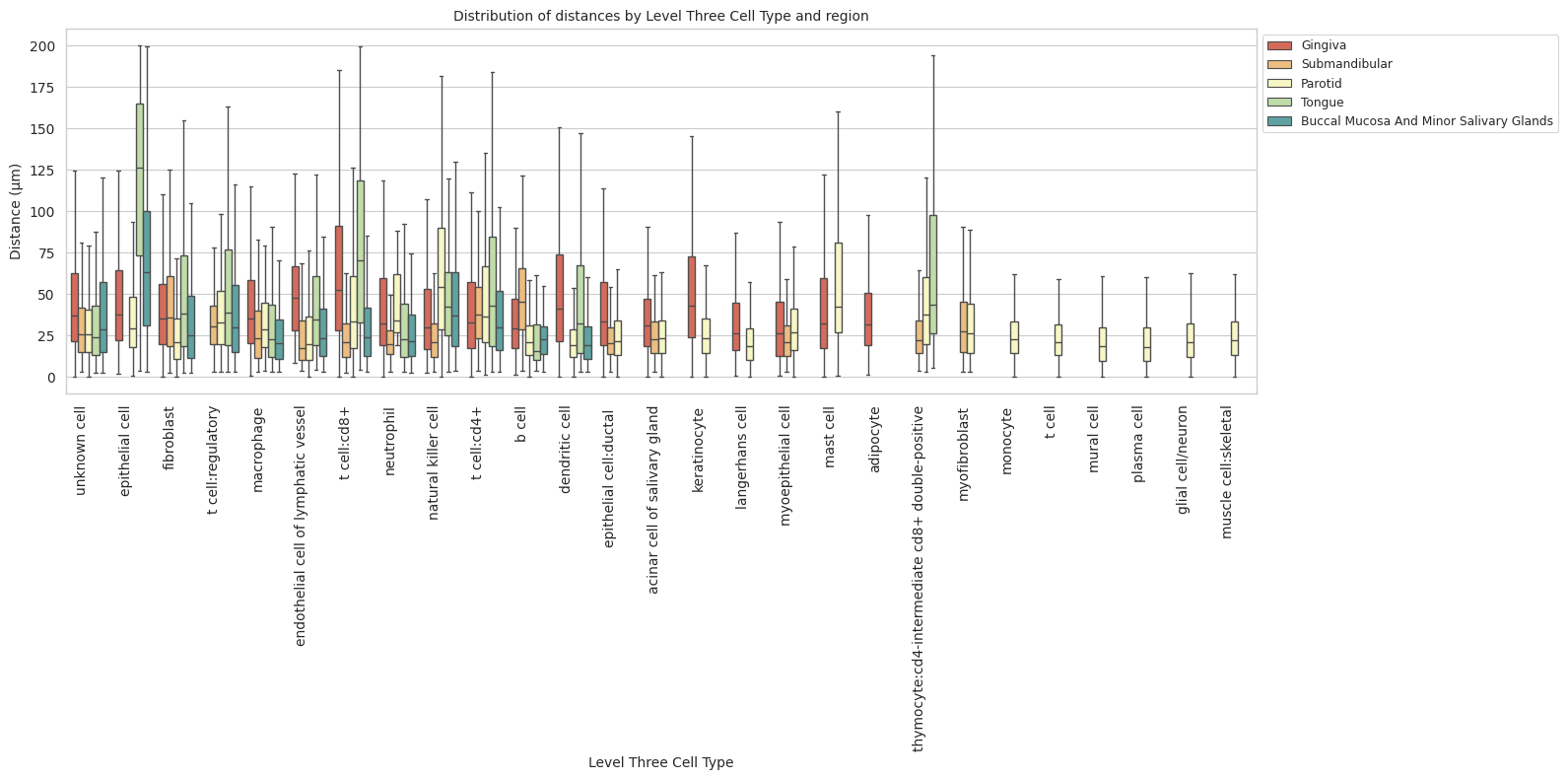 Analyze and visualize cell-to-nearest-endothelial-cell distance distributions for the
